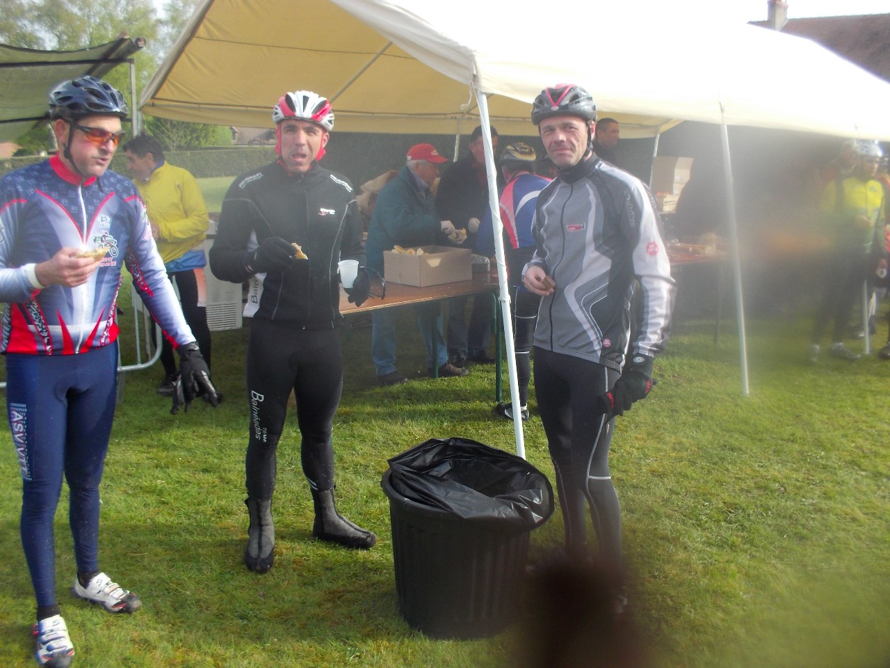 Notre petit groupe d'énervés de la manivelle n'ayant pas fait le déplacement pour les grillades nous voila repartis griller du pneu sur les chemins. Griller du pneu, il n'y avait que ça à faire car le tracé était plutôt roulant voir très roulant. Heureusement qu'on avait sorti les grosses cuisses !! Un petit passage boueux à se mettre sous la dent histoire de salir les vtt et nous voila de nouveau au 2° passage du fameux ravito... re-grillades. Rassasiés, nous repartions pour les 28km restants avant La Ferté. Rudy ayant un peu de plomb dans l'aile nous decidions de lever le pied pour un retour tranquille,"j'en entends déjà qui rigole". Nous roulions plutôt cool tous les 4 et pour une fois nous tenions nos promesses, quand un vététiste venu de nul part avec un beau scott noir et vert et jogging de l'époque de Véronique et Davina nous déboite avec une insolense: limite du manque de respect. C'est à cet instant que nos bonnes résolutions sont tombées à l'eau, mais là, c'etait un cas de force majeur : la réputation et l'honneur de l'ASVVTT étaient baffoués. Passage sur la plaque et comble du bonheur quelques centaines de mètres avant de le rejoindre retour sur la route; les grosses cuisses ont fait le reste, mais Rudy en difficulté avec son derailleur avant ne pouvait mettre du gros braquet. On se relevait et Rudy revenait sur nous avec notre acolyte plutôt vaillant et surpris de ce qui lui arrivait. L'acolyte au jogging vintage en profita pour reprendre le large. Il restait environ 20/25 km à faire. Rudy est rentré à son train pendant que nous repartions en chasse de l'insolent du jour pour la seconde fois. Cette fois, nous le garions definitivement et Cyrille dans un grand numéro de manivelle nous ramèna à La Ferté avec le compteur bloqué entre 30 et 38 km/h tout du long. Arrivés à La Ferté, même pas fatigués, "c'est juste pour la rime" nous avons profité d'un encas bien merité: petits toasts avec chèvre-chauds et vin blanc pétillant servi à table: La classe !!! Malgré notre âge avancé et Yves notre ancêtre qui sortait du challenge de Vienne en Val sur route la veille, nous avions encore la force de nous servir seuls ,mais c'est sûrement ça l'esprit cyclosportif.