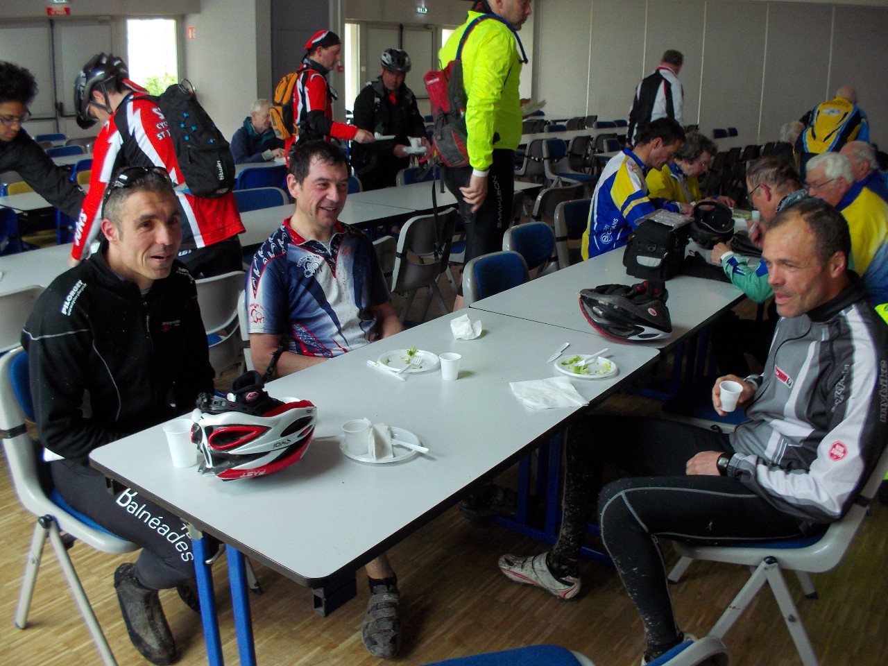 Ce dimanche nous étions 4 Viennois à participer à la contreversée rando de La Ferté sous le label FFCT: Guylaine, Rudy, Cyrille,Yves et Philippe P. présents dès 8h00 dans la salle communale face à la gare de La Ferté St Aubin. Inscriptions faites, bracelet de reconnaissance autour du poignet, nous voilà partis entre garçons sur le 70 km, Guylaine restant sagement sur le 50km. Nous nous sentions un peu seuls avec nos pneus à crampons car la grande majorité des participants étaient des cyclotouristes. Il faisait environ 8° malgré le soleil matinal, c'était froid, nous aurions sûrement les chemins pour nous seuls, nous voilà partis direction le chateau de La Ferté, le ton etait donné. Echauffement à 25/30 km/h le long de la riviere"le Cosson", du coup il faisait un peu moins froid. Premier arrêt au ravito des 25km: ravito commun route et vtt et commun à tous les parcours. (Vu le nombre de goinfres cela justifit les bracelets donnés au départ). Beau ravito avec barbecue et grillades à volonté et les classiques pains d'épice, chocolat et compagnie...